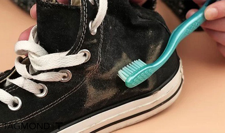 برای تمیز کردن کفش با جوش شیرین بهتر است جوش شیرین و آب را باهم ترکیب کنید و خمیر آن را روی محل های کثیف کفشی که خاک آن را پاک کردید بزنید.